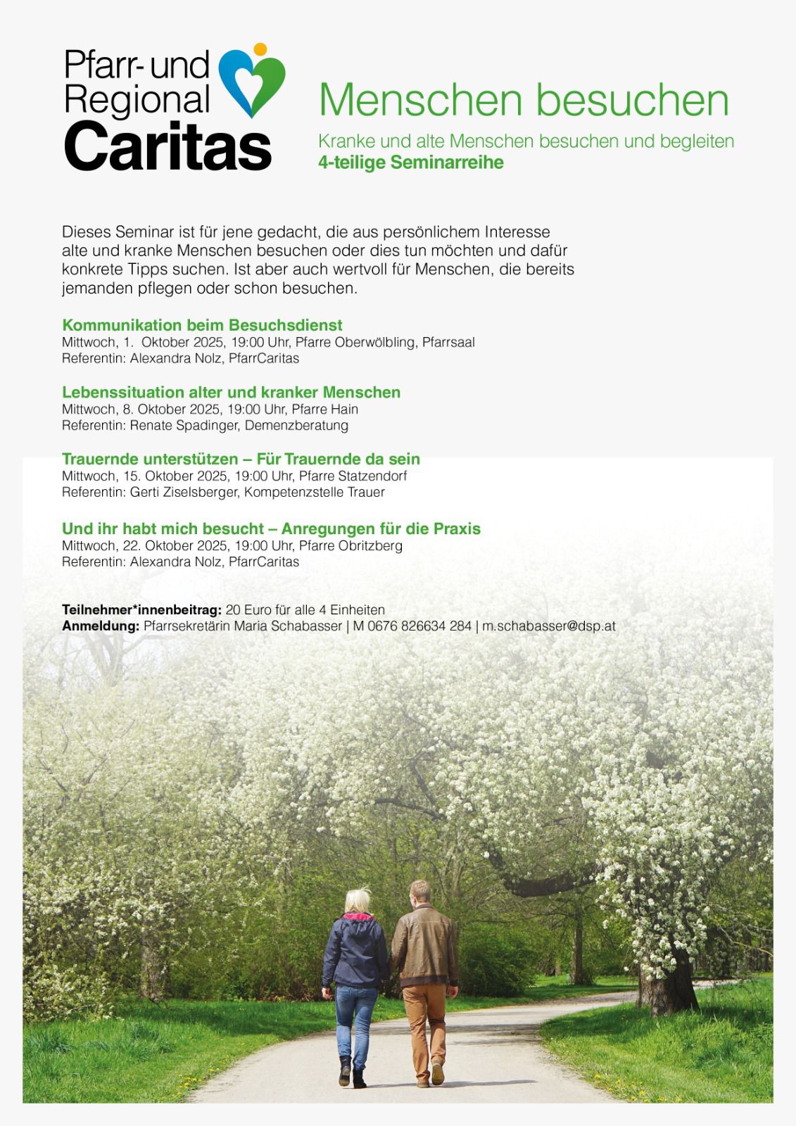 Dieses 4-teilige Seminar der Pfarr- und Regional-Caritas ist für all jene gedacht, die aus persönlichem Interesse alte und / oder kranke Menschen besuchen oder dies tun wollen, und dafür konkrete Tipps suchen. Es ist aber auch wertvoll für jene, die bereits jemanden pflegen oder besuchen.