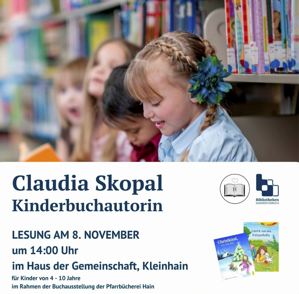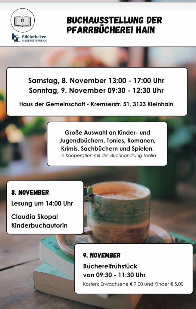 8. Nov.: "Buchausstellung der Pfarrbücherei Hain", 13 - 17 Uhr, "Kinderlesung mit Claudia Skopal" um 14 Uhr, HdG