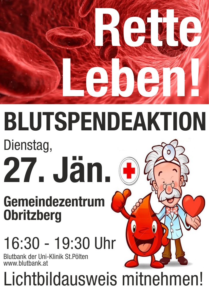 27. Jän.: Blutspenden Gemeindezentrum, 16:30 - 19:30 Uhr